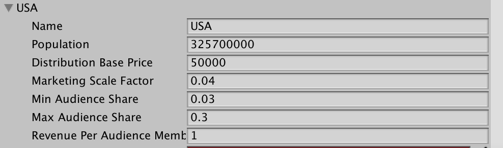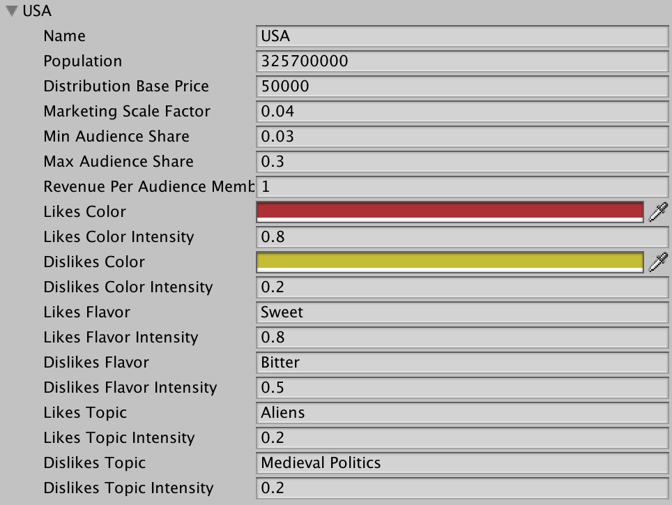 For example, if the product was red, this matches the “Likes Color” for the USA market, and so the likely audience share would be increased in proportion to the “Likes Color Intensity”. Conversely, if the product was yellow, this matches the “Dislikes Color” for the USA market, and so the likely audience share would be decreased in proportion to the “Dislikes Color Intensity”. The smart move, therefore, for maximising the market share to the USA would be to make sweet, red products that are about aliens. A product that was yellow, bitter, and about medieval politics would fail to sell very well at all.