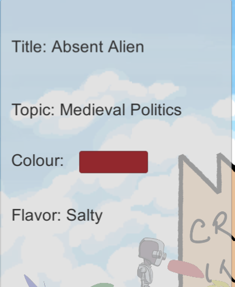 The “Creative Industry” in the game works as an independent entity: the player character has no influence over the products that the “Creative Industry” produces, nor do they have exact control over when the products are produced. The products produced are randomly generated from a pool of characteristics: Color, Topic, and Flavor. These characteristics represent abstractions of the notion of specific tastes of both local creators and international markets, and also attempts to encode the notion of ‘cultural odor’ (Iwabuchi 57):