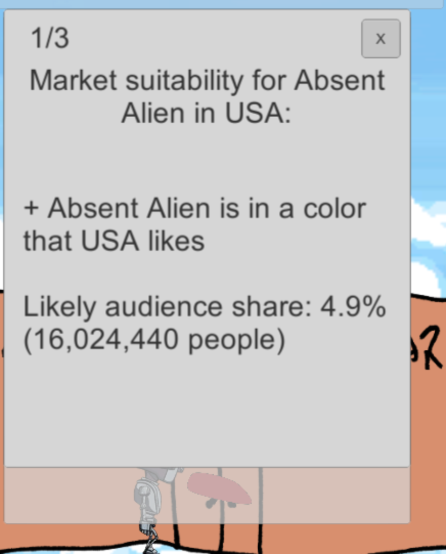 Each product produced by the “Creative Industry” lands on the ground in the game. The player character picks a product up and takes it first to “Market Research” where an audience share estimate is generated for each target international market based on the match (or mismatch) between the Color, Topic, and Flavor preferences of the the area or zone: