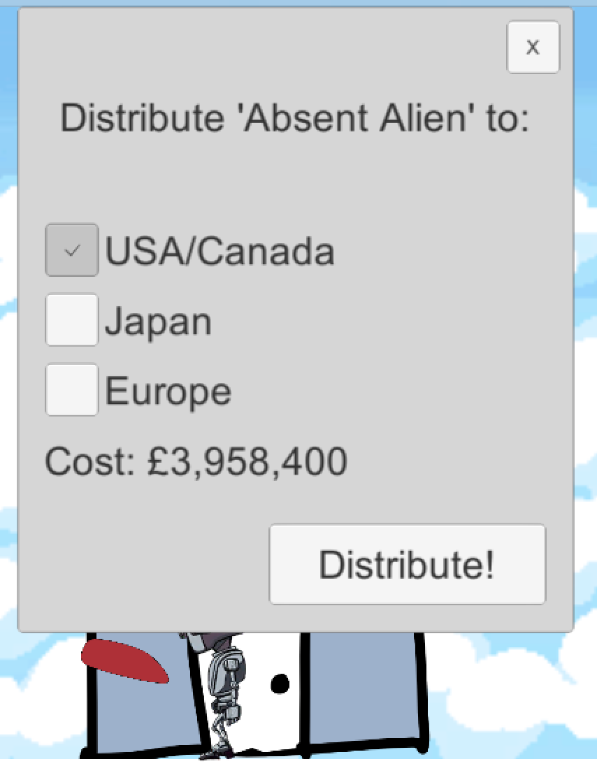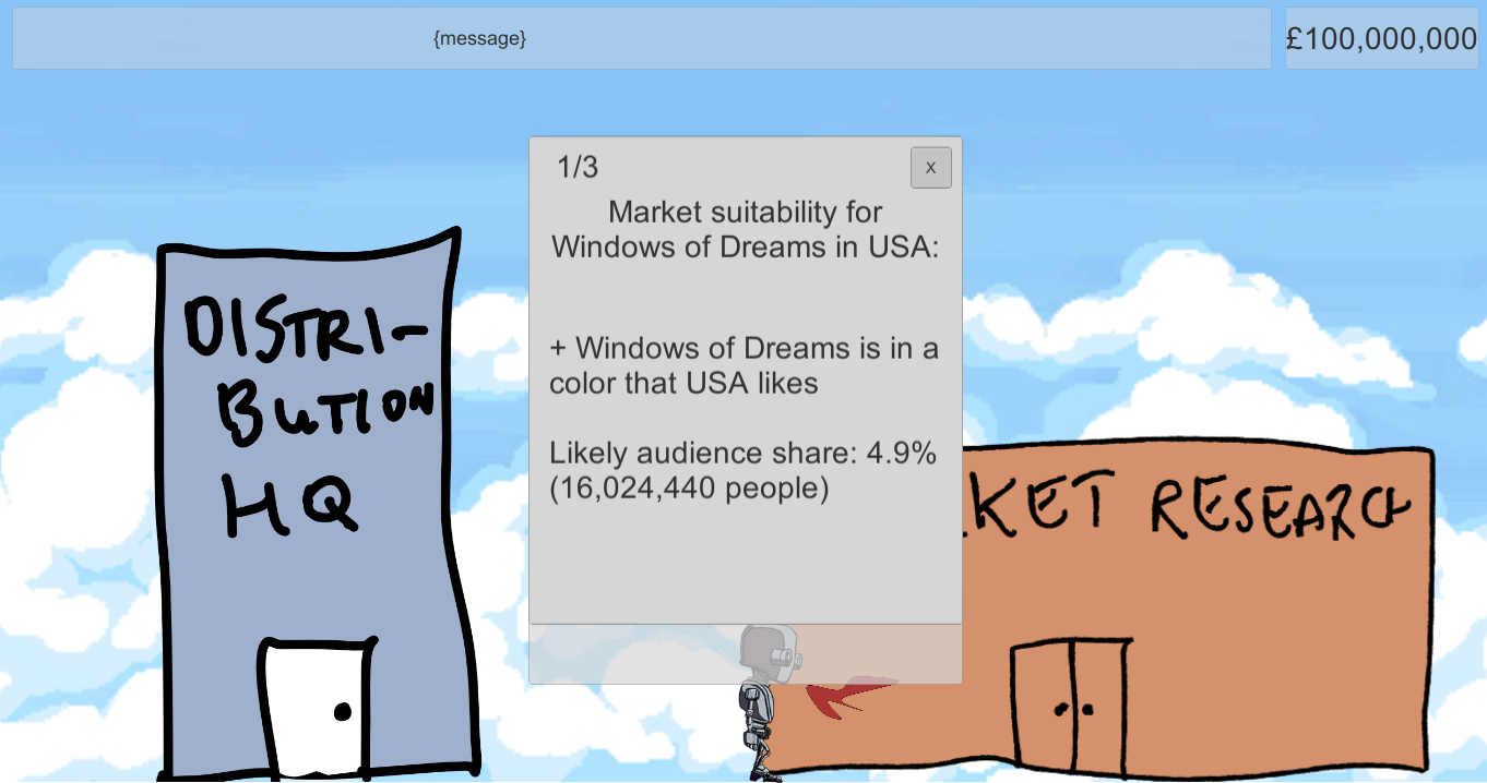 The player takes on a kind of a meta-role as a controller of the processes around the sale and localisation of creative products for foreign markets. Starting with a fixed budget of £100 million, the player must balance export and distribution costs against revenue from international markets, given imperfect, limited information and the potential for tastes and preferences to shift over time.